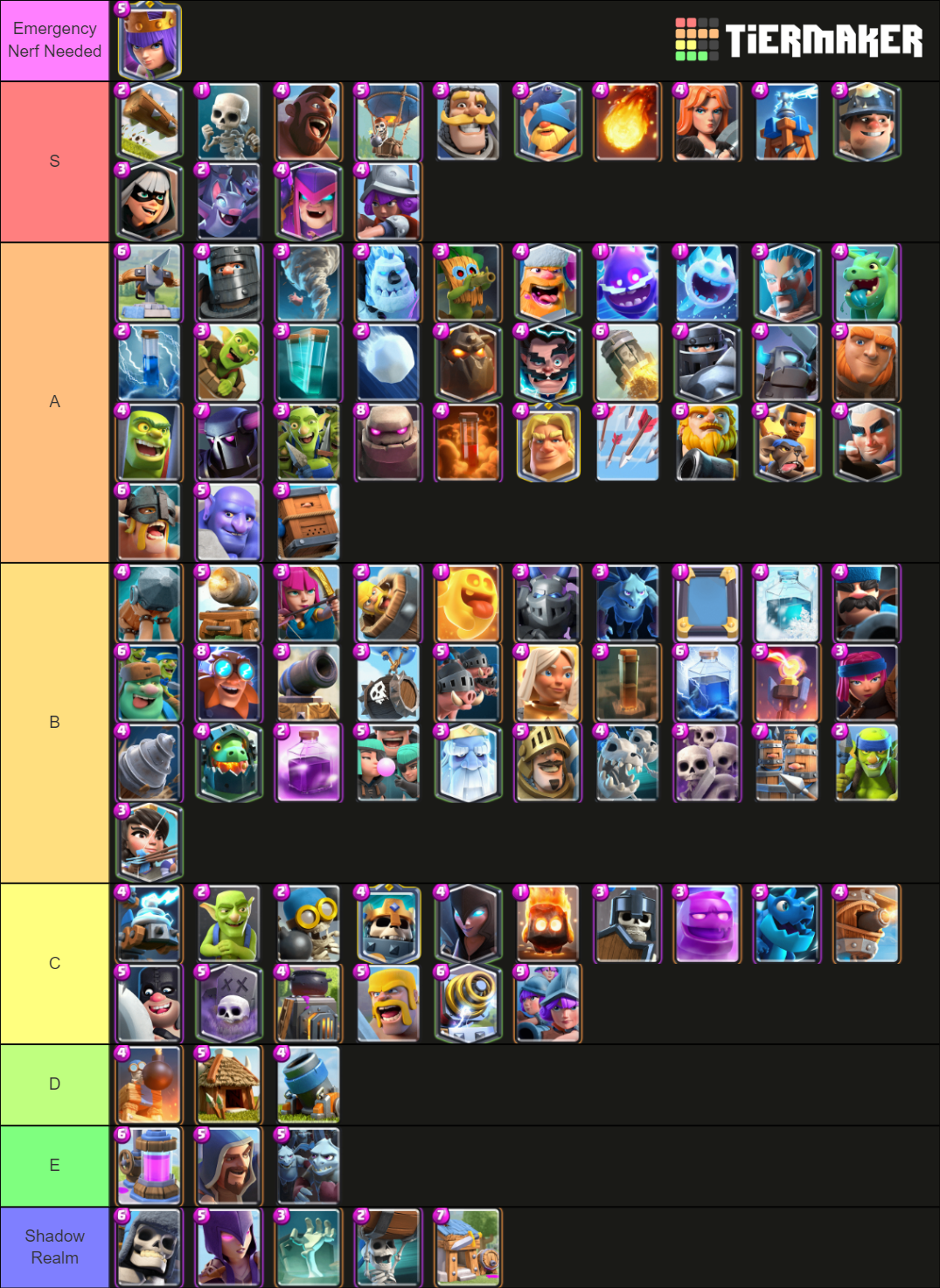 Create a ranking for Clash Royale Card. The most powerful cards are at the top of the list while the weakest cards are at the bottom. S being the.